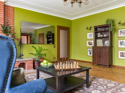 Стиль интерьера – яркая неоклассика: с традиционным кирпичным камином соседствует колоритный пейзаж на стене и мебель в английском духе. Ощущение уюта поддерживают двери Галант в натуральном шпоне. Полотна дополняет стекло с алмазной гравировкой: благодаря этому декоративному элементу интерьер становится ещё изысканнее.
