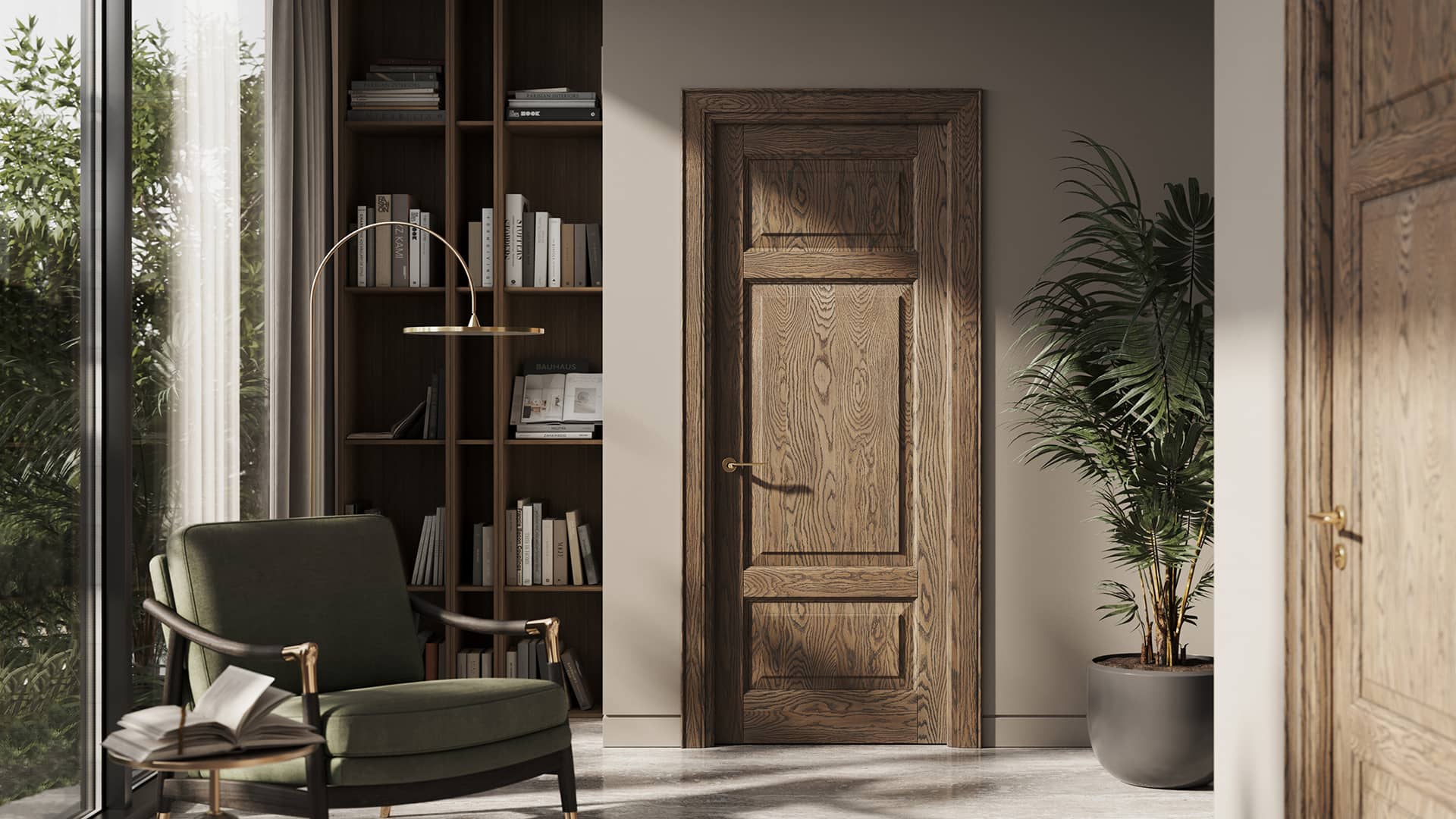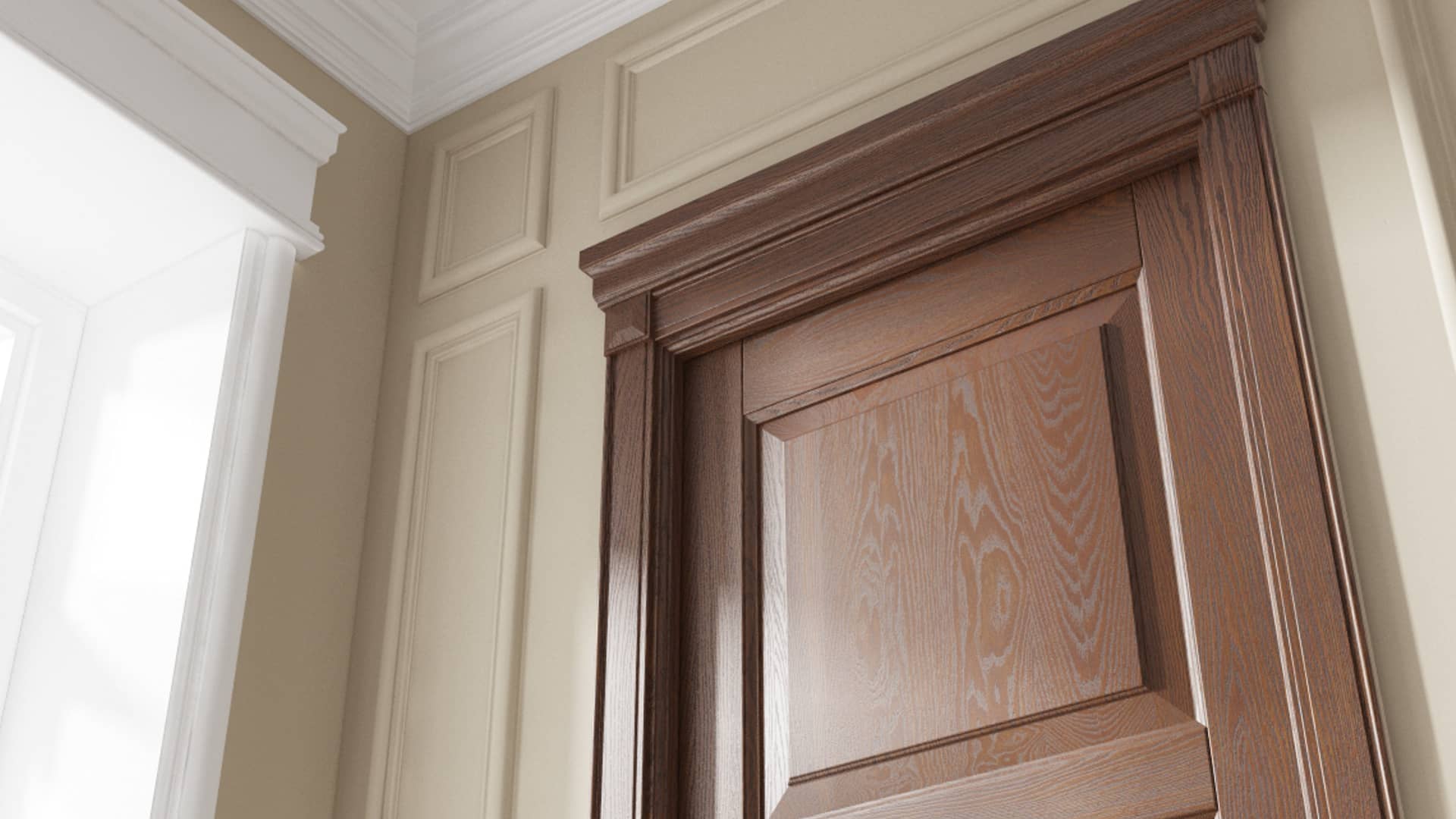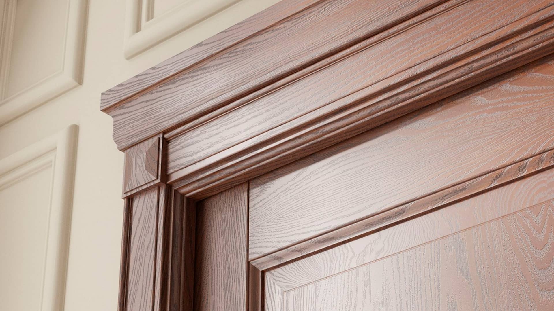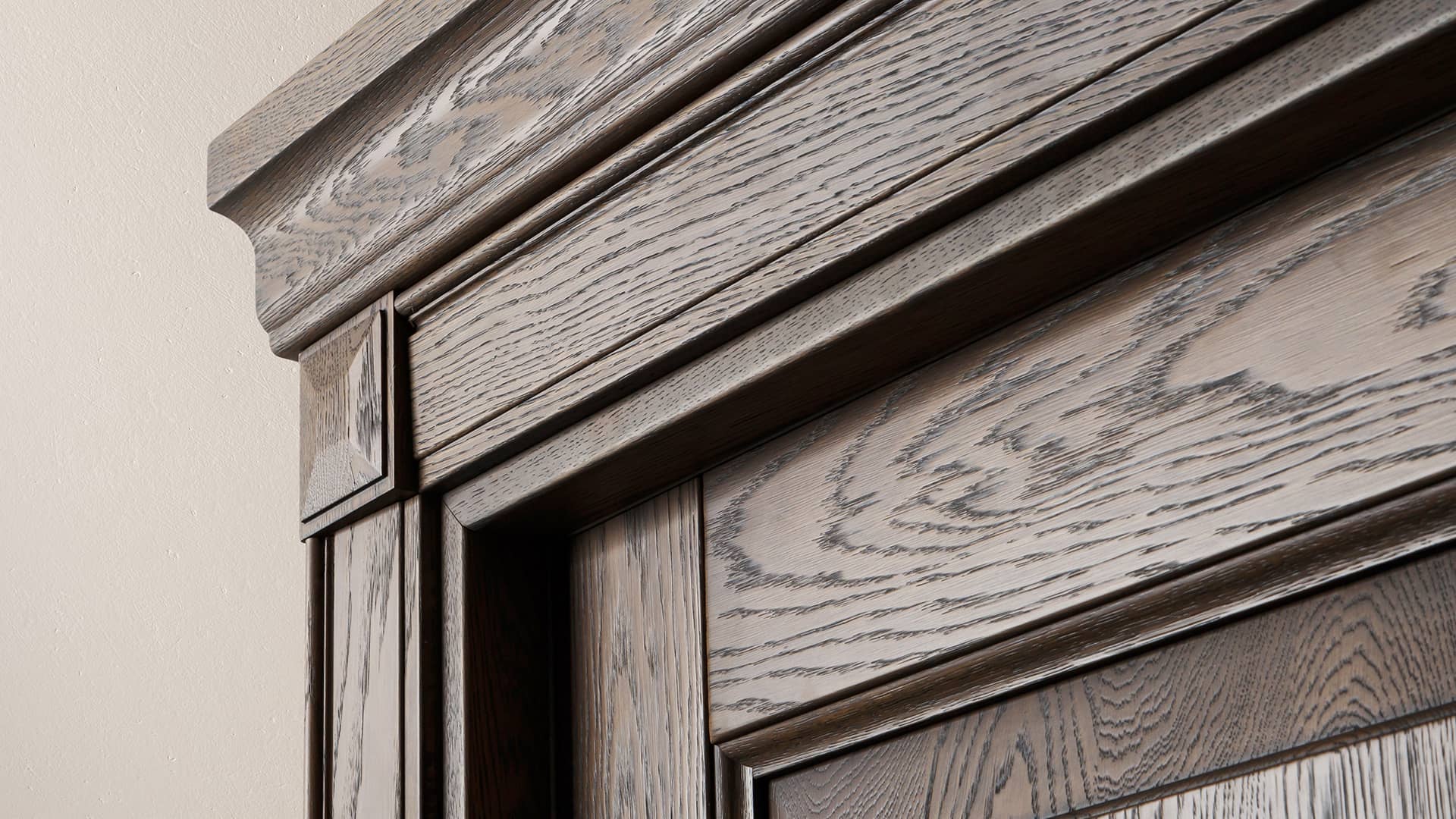 Традиционные формы из массива дуба и бука в отделках, максимально раскрывающих природную красоту дерева. Двери с классической деревянной решёткой созданы специально для парадных проёмов.